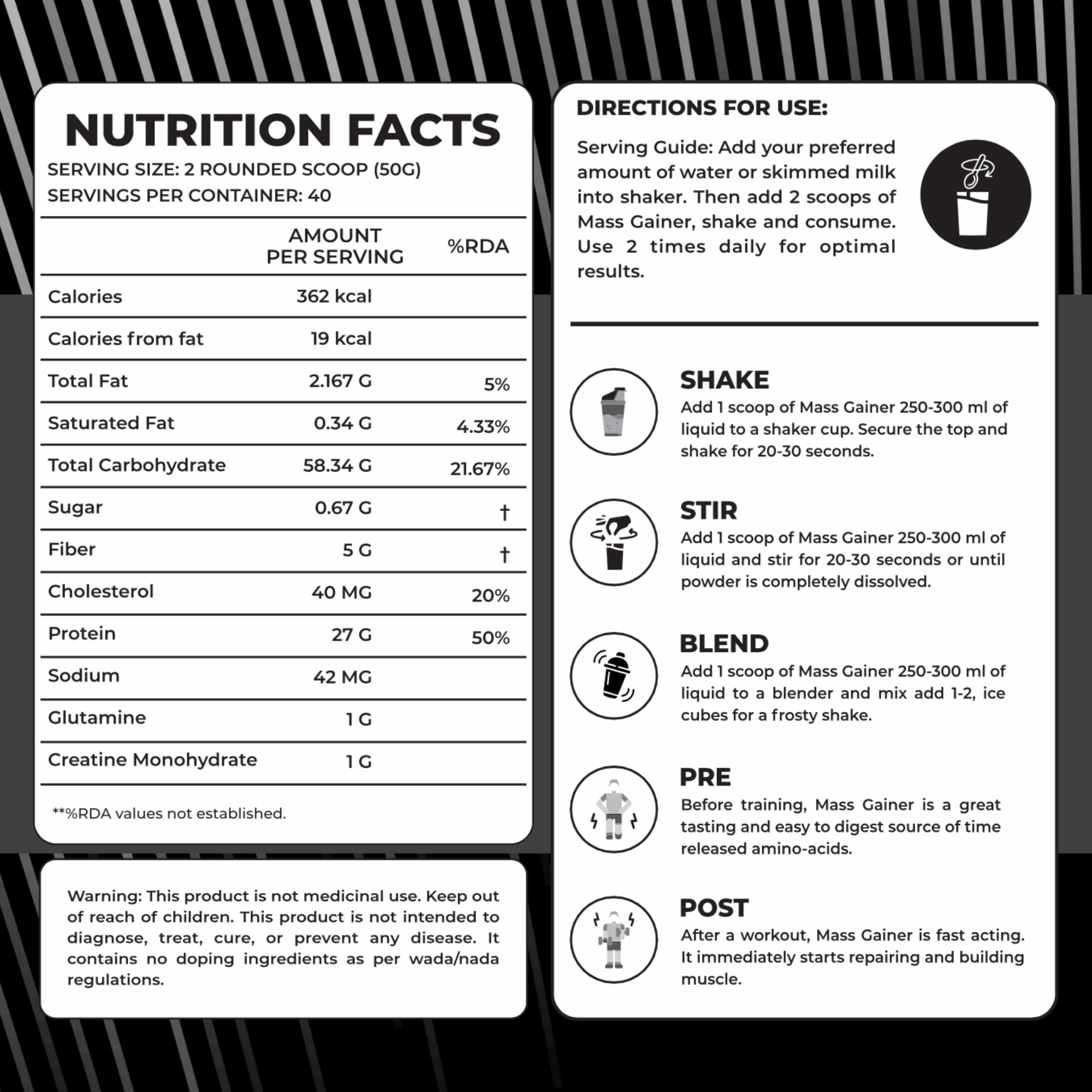 * 362 Kcal Calories: The critical extra calories essential for massive muscle gains.