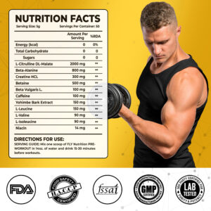 * 2000mg Citrulline Malate: This increases nitric oxide production in the body, which improves blood flow to the muscles. The result is an amazing “muscle pump” that ensures your muscles get the essential nutrients and oxygen they need during your workout.