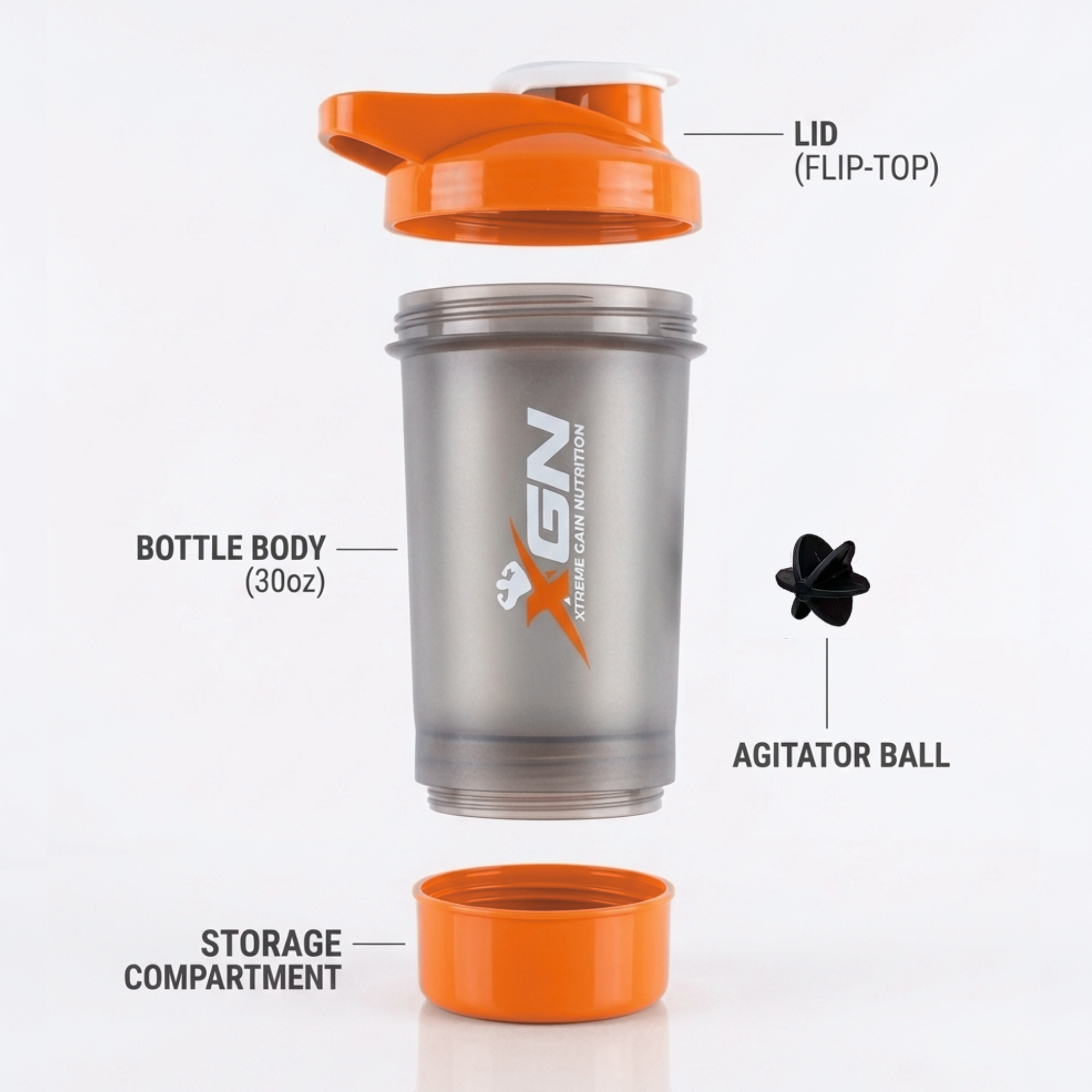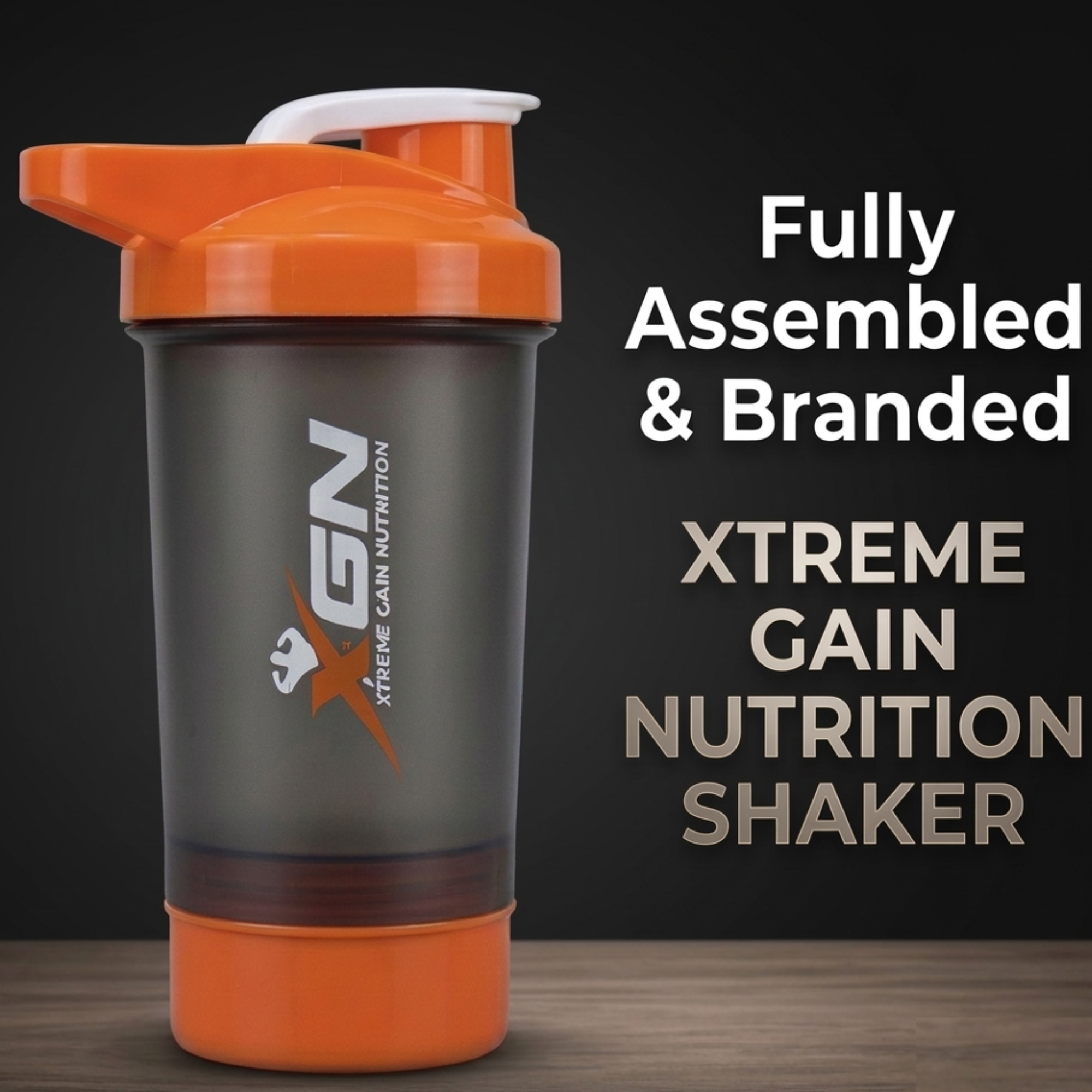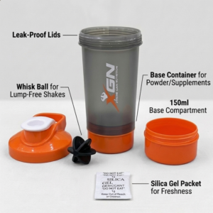 The XGN (Xtreme Gain Nutrition) Ultimate Shaker is the all-in-one solution for your fitness routine. Designed with a sleek smoke-grey body and vibrant orange accents, this shaker is built for athletes who need their supplements on the go without carrying extra boxes.