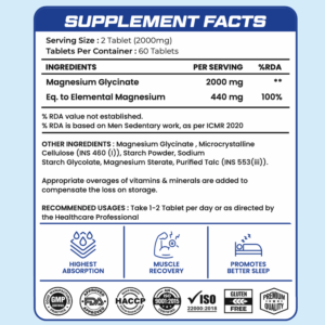 Each two-tablet serving contains 2000mg of Magnesium Glycinate, which is equivalent to 440mg of Elemental Magnesium. This amount fulfills 100% of your body’s daily magnesium requirement (RDA).